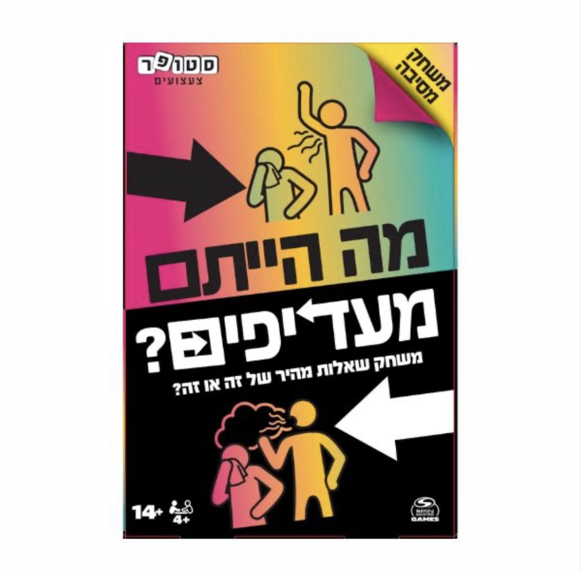 מה הייתם מעדיפים? – משחק קלפים מטורף לכל המשפחה והחברים! 200 שאלות ב-4 קטגוריות שיגרמו לכם לצחוק, להתווכח ולגלות צדדים מפתיעים אחד אצל השני.