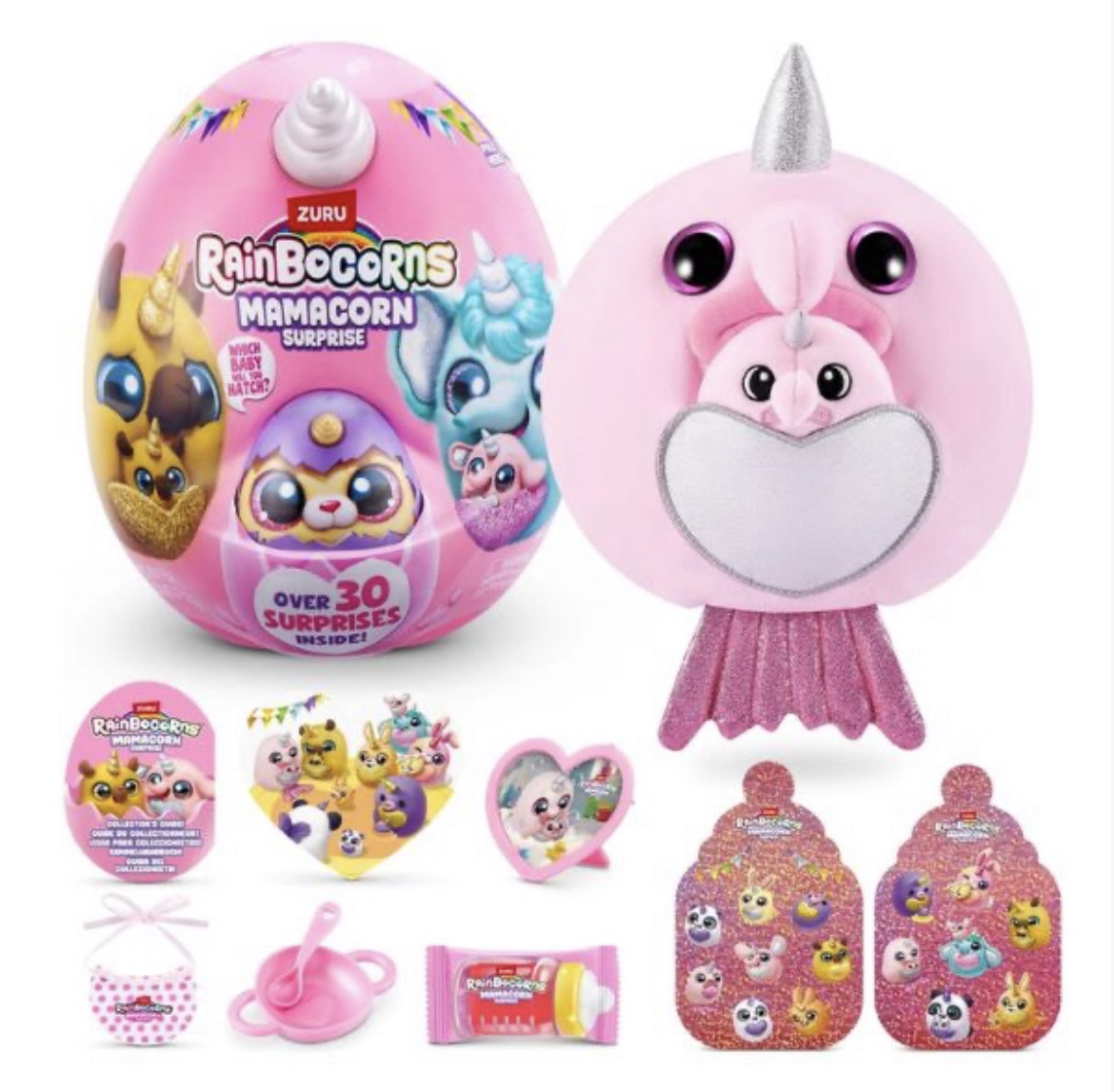 תכולה: בובת קטיפה מאמאקורן הפתעה אחת של Rainbocorns, ביצה אחת, בובת קטיפה לתינוק אחת, קערה אחת, כף אחת, סינר אחד, תמונה אחת, מסגרת תמונה אחת, בצק משחק אחד, 19 מדבקות, תעודת לידה אחת ומדריך אספנים אחד